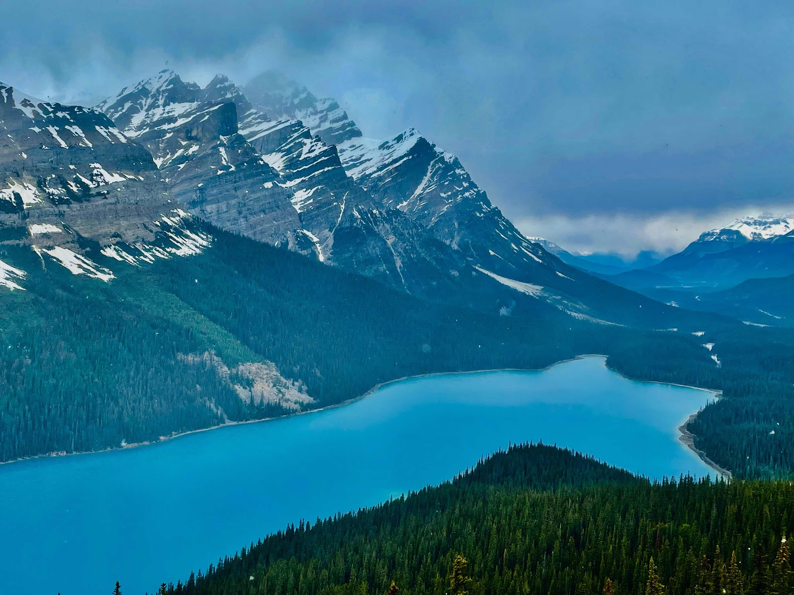 Stop #1 Peyto Lake - We are currently under a snow storm watch and it started to flurry just as we got to this look out point. But that blue! This was a half hour hike, and a good one to start with so we could warm up.